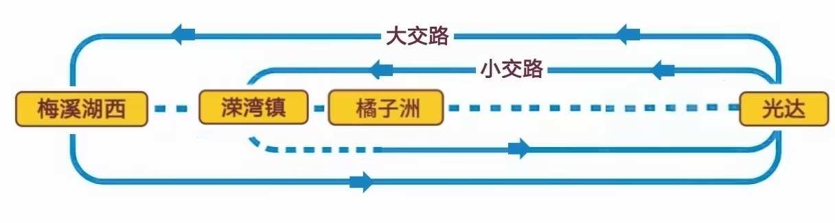 大小交路运行期间,由东往西方向,大交路列车从光达站-梅溪湖西站载客运行,小交路列车从光达站-溁湾镇站载客运行;由西往东方向,大交路列车从梅溪湖西站-光达站载客运行,小交路列车从橘子洲站-光达站载客运行。