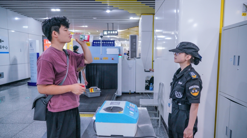 为避免携带汽油等违禁液体进站,安检人员会提醒乘客将背包内或手中液体进行检查,乘客可选择“试喝一口”的方式,也可通过液体检测仪进行检测。