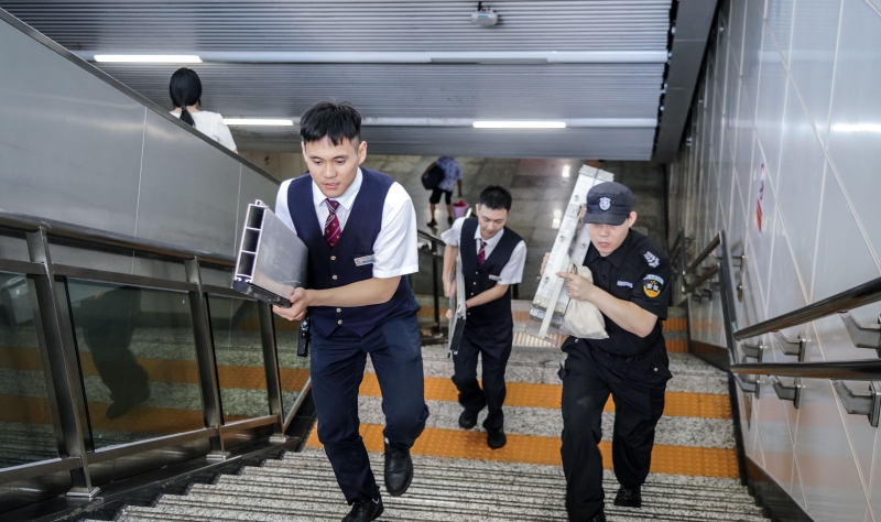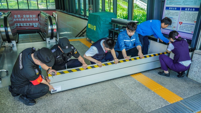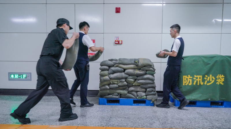 每年进入汛期,线网各站点便已备好各类防汛物资,如沙袋、防洪挡板、彩条布等,工作人员将物资整齐码放在指定位置。一旦车站出入口附近积水可能入侵车站,这些看似不起眼的装备,便会在工作人员的熟练操作下迅速“上岗”,在车站出入口筑起防护墙。