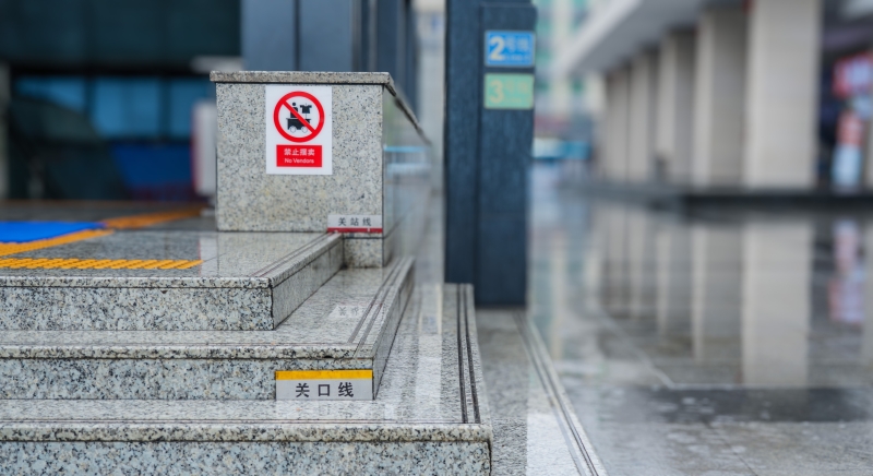 为了保障运营及设备安全,车站会在出入口设置黄色关口线以及红色关站线。出入口平台台阶超过三级的车站,关口线会设置在第二级台阶处,关站线设置在出入口平台底部。出入口平台台阶不足三级时,车站则直接在出入口平台底部设置关站线。
