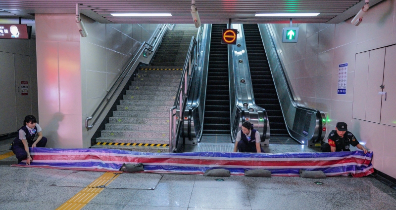 一旦出现积水倒灌车站的情况,工作人员将在车站与外部区域连接处,以防淹挡板设置第二道防线,无外部区域连接的车站,则会在车站出入口台阶下通道横截沟处设置第二道防线。