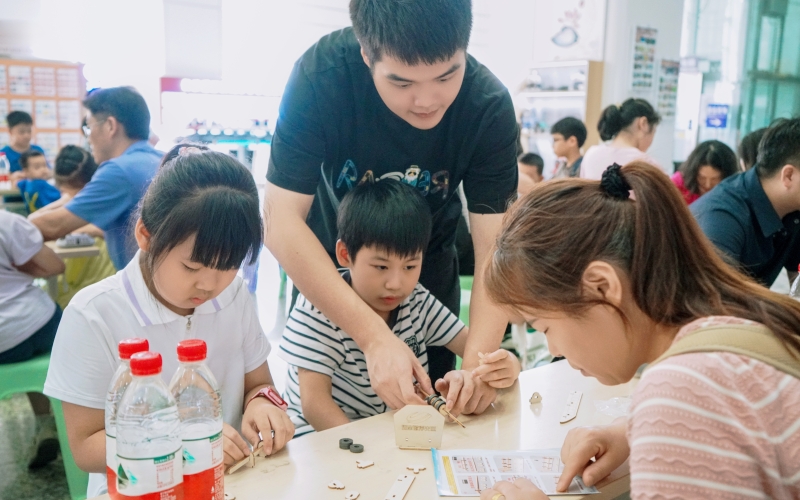移步到磁浮城市航站楼后,孩子们实地观摩了从自助值机到行李托运的全流程,直观感受“空铁联运”的现代交通优势。在最受孩子们欢迎的磁浮车模手工制作环节,孩子们化身“列车设计师”,与家长齐心协作挑战完成了磁浮模型制作。
