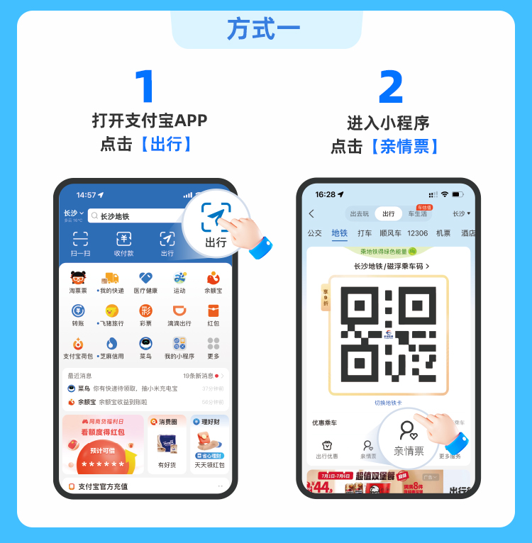 方式一:打开支付宝,点击“出行”选择地铁码“长沙地铁/磁浮乘车码”,点击页面下方菜单栏“亲情票”,进入长沙地铁“亲情票”页面。