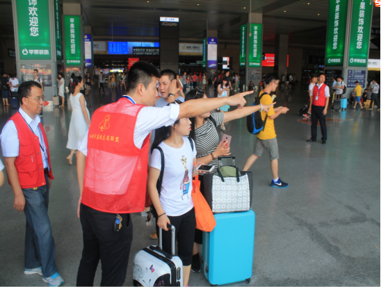 志愿服务队每日4人轮值,已累计提供服务近8000小时,将“党建红”深入融合至服务一线。他们活跃在人群中,及时为行李繁重的旅客伸出援手,细心帮扶老幼病残等重点旅客,提供搀扶、行李搬运与路线指引等暖心服务,切实践行“真情服务”理念和“首问负责制”,有效缓解现场服务压力,助力暑运保障平稳、安全、有序推进。轨道物业管理党支部以微光汇聚炬火,让“党建红”成为火车南站暑期流动的风景线。